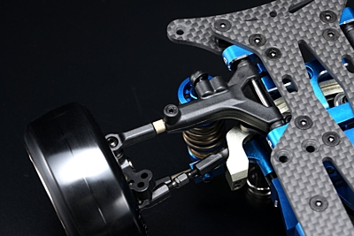 While adopting a drive style that provides a smooth launch, the counter gear and short belt also bring out a direct feel. The high-pitched drive sound and sharp pickup, reminiscent of a multi-cyl- inder engine, are appealing and make you want to grab the throttle. The rigidity of the front end increases the surface pressure on the front tires, which enhances controllability when exiting corners. Both front and rear suspension arms are suspension pin type H-arms, but they can also be changed to the conventional MD series A-arms, and we look forward to the development of optional parts in the future.